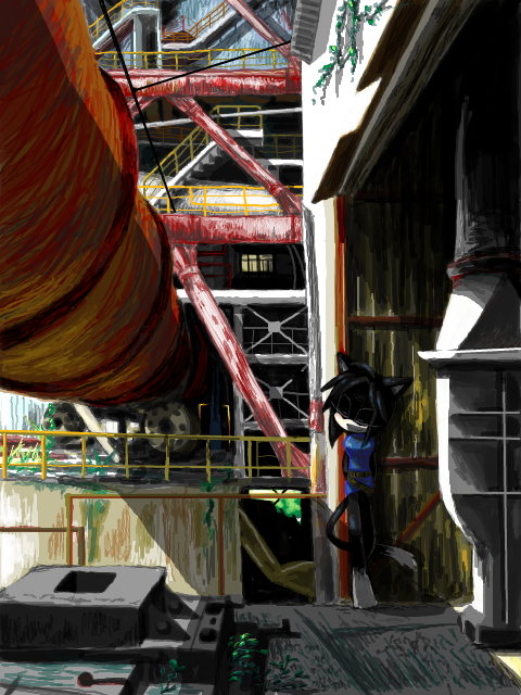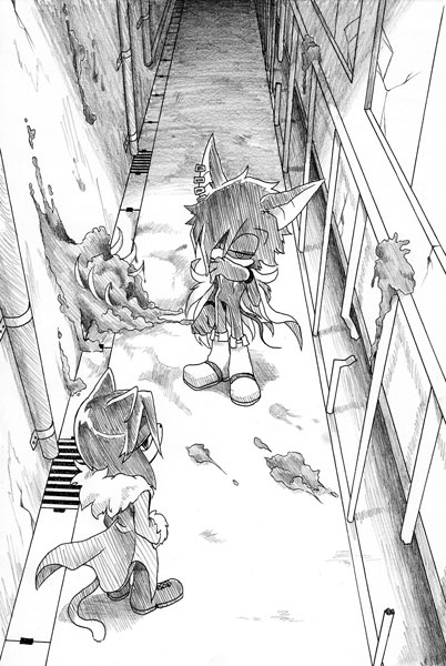 廃墟の中 階段とか鉄錆とかたくさん描けて幸せ 授業中眠気で死ぬところだったので何かラクガキしないと、と思い休み時間に描きだしたらごちゃごちゃになってしまった一枚。でもこうゆうふうにごちゃっとさせるの大好きなんだ… 裏路地 お肉とアドくんが描けて幸せ^o^← どんだけアドくん好きなんだ…だって好きなんです(´・ω・`)殴 二人がタッグを組んだら、こうなるのだろうかという妄想。 描き終わってからここまでしないだろアホ璽聖め…と自問自答したorz